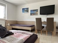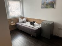 Wir bieten neu eingerichtete Zimmer mit eigenem Bad, Bett, Schrank, Schreibtisch, Stuhl, Kühlschrank und Flachbildschirm.